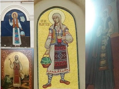 Sfânta Mucenică Filofteia face parte din seria Sfinților Români, alături de alte figuri de bogată viață duhovnicească și mare pildă în apărarea credinței naționale strămoșești. Mai mult, ea se încadrează într-o categorie mai restrânsă de chipuri de sfinți cu o reprezentare iconografică tradițională aparte: în marea majoritate a icoanelor și picturilor murale Sfânta cu data de celebrare pe 7 decembrie este întruchipată în port popular. Și anume în costum național din zona Argeșului, mai precis în straie tradiționale purtate pe Valea Topologului.